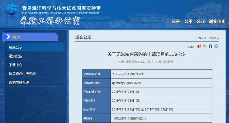 我公司無(wú)磁轉(zhuǎn)臺(tái)產(chǎn)品成功中標(biāo)青島海洋科學(xué)與技術(shù)試點(diǎn)國(guó)家實(shí)驗(yàn)室采購(gòu)項(xiàng)目