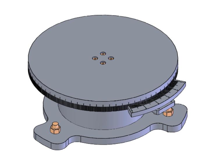 轉臺可調節(jié)水平的圓柱形底座,在所述的圓柱形底座上安裝有調平螺釘組件用于調節(jié)底座水平,航向轉動臺面上刻有刻度,通過操縱航向盤和鎖緊機構,與航向差分盤配合完成航向角的確定。也可以通過調整航向盤的位置,通過無磁編碼器的數(shù)字輸出數(shù)值記錄角度。